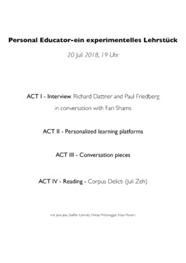 Das experimentelle Lehrstück Personal Educator handelt vom Spiel. Es entwickelt sich über drei Aufführungen im Zusammenspiel mit seinen Besuchern/Teilnehmern und läd zur gemeinschaftlichen Reaktion auf seinen Inhalt durch Teilnahme und Feedback ein.